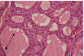Figure 5: Pinocytosis was observed in the follicles in some nodules (arrow). H&E stain x200.