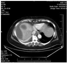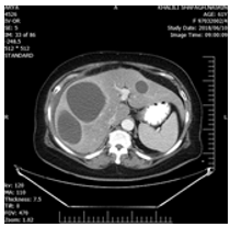 Figure 1: CT-scan of patient show three intact cystic lesions in the right and left lobes with mild effusion in around the liver.