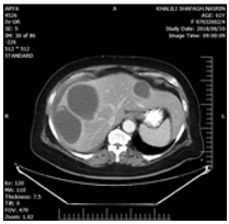 In treatment history, a shoulder Pain was present which not associated with any trauma or GI tract problem. That time she was conscious, only complaining of severe shoulder pain and mild abdominal pain. The shoulder movement was normal. The only physical finding was mild tenderness and guarding in all quadrants of the abdomen. Her blood pressure120/80 mmHg, heart rate was 95 beats min, respiratory rate 18 bpm, WBC=21000. Three days after admission, she had a CXR showed that shoulder joint was normal but in chest mild pleural effusion and atelectasis was present with on the right side. The patient underwent ultrasonography which showed one intact cystic lesion (42x38mm) in the left lobe and two cysts in the right lobe (87x83mm) and (67x4 mm) and computed tomography of abdomen showed as U&S but showed fluid at sub diaphragmatic location and around with on liver (Figures 1-3).