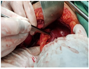 Walling of around the liver was performed with wet gauze of with hypertonic saline, Aspiration of cyst was performed (Figure 6).