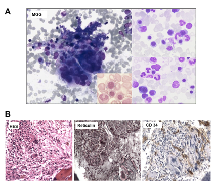 A: Bone marrow aspirate smears reveal an increase in the number and size of megakaryocytes with deeply lobulated (stag-horn-like) nuclei and large platelets clumps. Note that pictures on the right pictures show an important dyserythropoiesis with multinuclearity, cytoplasm vacuolization and ring sideroblasts after Perls stain.