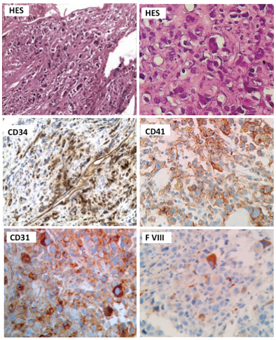 These cells were of medium to large size, with a unique large round nucleus, rarely bi-nucleated with nucleoli and a clear chromatin. Some cells were larger and exhibited megakaryoblastic differentiation. This tumoral infiltrate occurred in large clusters separated by fibrotic patches. An exhaustive immunohistochemistry study showed a high CD34-positivity and reacted with antibodies to megakaryocyte-restricted antigens CD41, CD31 and Factor VIII. All the cells strongly expressed CD41 and CD31, whereas factor VIII expression was restricted to the larger atypical megacaryocytes (Figure 2). The pan-leukocyte marker CD45, myeloid (MPO, CD15, CD117) and lymphoid (CD20, CD79a, CD3, CD5) antigens were absent. These features matched with a megakaryoblastic granulocytic sarcoma. The concomitant bone marrow aspirate did not show evidence of blast excess.