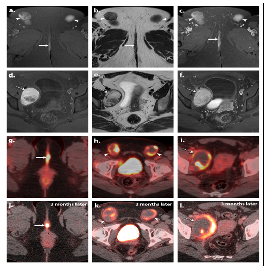 Figure 1: Baseline MRI Axial T1 FS (a and d), Axial T2 (b and e) and Axial T1 FD post contrast (c and f) images show the primary lesion in the right labia (white arrows) and large necrotic bilateral inguinal lymph nodes (white arrowheads) with T1 hyperintense signal, T2 hypointense signal and a heterogeneous post contrast enhancement. Large necrotic right iliac lymph node (dotted white arrow) is also noted with T1 hyperintense signal, and T2 heterogeneous signal with cystic degeneration and a heterogeneous post contrast enhancement.