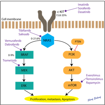 Figure 2: Schematic of the RAF/MEK/ERK and PI3K/AKT/mTOR pathways involved in the development of vulvar melanoma and the different targeted molecular therapies used.