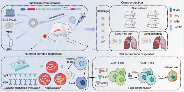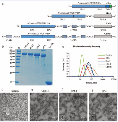 Using a baculovirus-insect cell expression system, the researchers successfully produced an HA-ferritin nanoparticle vaccine. This innovative vaccine consists of self-assembling ferritin nanoparticles (f) that serve as an antigen delivery platform, displaying the extracellular domain of Hemagglutinin (HA), three sequential repeats of highly conserved M2e epitopes, and an M-cell targeting ligand (Co4B) on its surface (Figure 2).