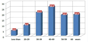 group with the lowest frequencies was 45-49 years (4.2%) and 50 – 54 years (4.3%).