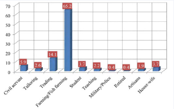 Figure 2 Cupation of respondents Shows that 65.2% of the respondents were farmers, and farming in these communities both combine crop, animal and fish farming. This is the predominant occupation of the community followed by trading which accounts for 14.1% of the respondents. They are only very few civil servants (5.9%) and military and paramilitary which each accounts for 0.4% has the least number of people engaged in the profession across all surveyed settlements.