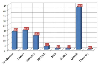 Figure 3 Education Status of the respondents Showed that 42.6% of the respondents have Qur’anic education (pre-primary school education) as their highest educational qualification, while 19.3% of the respondents were primary school leavers. 18.1%of the respondents have no form of education whether western or Islamic. Only 14.1% of the respondents attempted secondary school. The university graduate only account for 0.4% of the respondents. The level of education has been known the affect lifestyle and disease transmission.