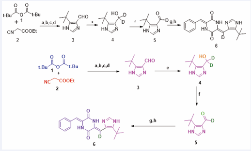 Figure 1 Synthesis of Deuterium-Substituted Plinabulin Derivative (MBRI-001). Reagents, Conditions, and Yield: (a) DBU, THF, 48 hours, 99%; (b) Formamide, 175°C, 36 hours, 45%; (c) LiAlH4, THF, 0°C to room temperature, 48 hours, 84%; (g) 1,4-diacetylpiperazine-2,5-dione, Cs2CO3, DMF, room temperature, 20 hours, 54%; (h) benzaldehyde, Cs2CO3, DMF, 50°C, 24 hours, 89%.