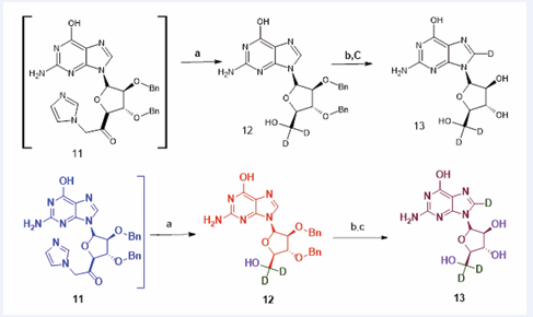 Figure 3 Synthesis of Deuterium-labeled Nelarabine Active Ingredient ([D3] ara-G) compound (13). Reagents and reaction conditions: (a) NaBD4, D2O, 18h, 50% for two steps; (b) HCOONH4, Pd/C, EtOD, reflux, 8h; (h) D2O, MW, 100°C, 1h (2 cycle), 45% for two steps.