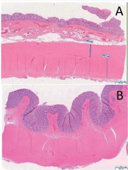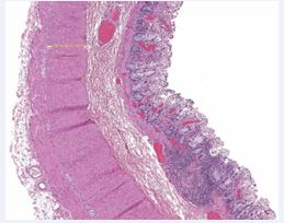 Figure 2 A/B: Hematoxylin & Eosin staining: Muscular hypertrophy, demonstrated with the measurements of the inner versus outer muscularis propria as shown in a specimen of a patient with severe chronic idiopathic constipation who underwent transanal rectosigmoid resection.