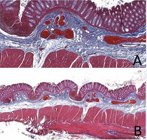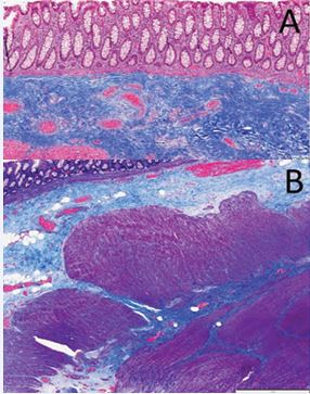 Figure 5 A/B: Masson’s trichrome staining of rectal tissue from a patient with severe chronic idiopathic constipation following transanal rectosigmoidectomy. The section demonstrates marked fibrosis within the lamina propria, characterized by an increased abundance of blue-stained collagen fibers. Cytoplasm appears pink and muscle fibers stain red, providing contrast that highlights the extent of collagen deposition and disruption of normal tissue architecture.
