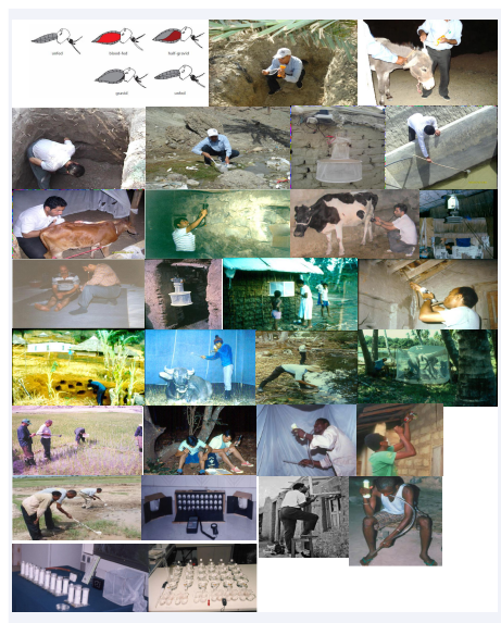 The main methods for entomologist and vector control specialist for doing the above-mentioned studies are: hand catch collection, spay sheet collection, shelter pit collection, human bait collection, animal bait collection, light trap collection, animal baited trap collection, human baited trap collection, exit trap collection, hut studies, mosquito dissection for sporozoite, oocyst and parous rate, Elisa test for antropophilicity index, larval collection using dipper, serological studies, bioassay and susceptibility tests, irritability test, biochemical and molecular tests (Figure 3) [12].