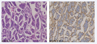 Figure 1: The IMPC tumor cells adhere to cell clustered structures with polarity reversed and located within empty stromal spaces.