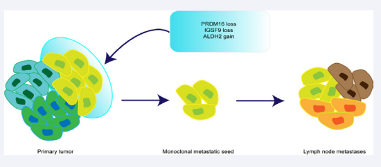 Figure 2: The monoclonal metastatic seed harboring the copy-number losses of PRDM16, IGSF9 genes, and the copy-number gain of the ALDH2 gene in IMPC primary tumor