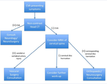 Figure 1: Proposed algorithm for the work-up of a patient with suspected CVA, carotid artery dissections, and/or high cervical disc herniation.