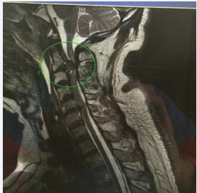 Figure 2: A sagital T2 image of the cervical spine demonstrating near complete occlusion of the spinal canal by C2/3 disc hernination with associated myelomalecia of the spinal cord.