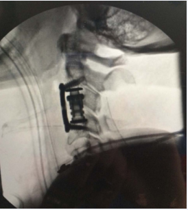 Figure 3: Demonstrates intra-operative fluoroscopic lateral cervical spine radiograph of the posterior decompression of C2-4 and C3 corpectomy with cage placement and anterior spinal fusion from C2-4.