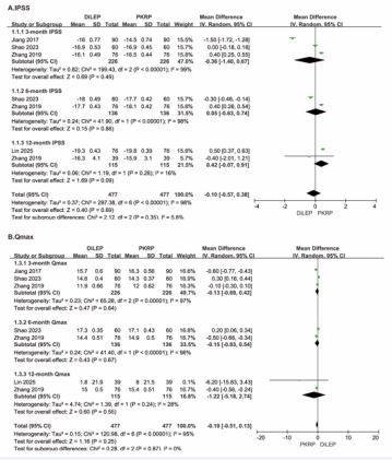 Functional outcomes including symptom scores (IPSS, QoL) and voiding parameters (Qmax, PVR) were reported preoperatively and postoperatively across all included studies. We extracted follow-up data at 3, 6, and 12 months postoperatively for analysis. Overall, no significant differences were observed between groups in most follow-up outcomes (Figures 5 and 6); however, 1470 nm DiLEP was associated with significantly better PVR at both 6 and 12 months (MD = −4.29, 95% CI (−7.61 -−0.97), P = 0.01; MD = −7.79, 95% CI (−13.10–−2.47), P = 0.004, respectively; Figure 6).