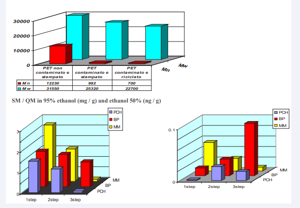 ? The differences in the Migration behavior of PET compared to the three contaminants and in the three simulants can be attributed to the change in migrant-polymer interactions and polymer- simulants as a result of recycling. In fact, PET, subject to subsequent recycling operations, undergoes significant changes in the parameters of molecular structure (Mw, Mn, MWD) (3-5) that modify the physical and Migration.