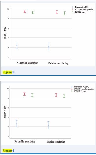 This retrospective study analyzed data from 625 patients who underwent posterior cruciate ligament (PCL)-sacrificing Total Knee Arthroplasty (TKA) between 2012 and 2023 at the Department of General Orthopedics 3, Orthopedic Institute Hospital “Banjica,” with a follow up period of 10 years [13-15]. The patients were divided into two groups: 469 patients (75%) who did not undergo patellar resurfacing with a polyethylene patellar button during TKA and 156 patients (25%) who did [16,17]. The 75%/25% split reflected patient-specific factors, including the presence of Rheumatoid Arthritis (RA), severe patellofemoral degeneration, obesity, or prior patellar fractures, as detailed below. Clinical and demographic variables were collected for each patient, including gender, age, cause of osteoarthritis (primary or secondary) [18,19], and previous surgeries on the contralateral knee or other joints [20]. All implants were cemented, and patellar components (when used) were dome-shaped. Functional outcomes were assessed using the Kujala Score, Functional Knee Society Score (FKSS), Knee Society Score (KSS), and WOMAC, while pain was measured via Visual Analog Scale (VAS).The study assessed these variables using chi-square tests for categorical data and t-tests for continuous data, with statistical significance set at p < 0.05 [21,22]. Patients were also evaluated for comorbidities such as hypertension (HTA) [23], diabetes mellitus (DM) [24], rheumatoid arthritis (RA) [25,26], and osteoporosis [27], among others, to identify any potential association between these conditions and the likelihood of undergoing patellar resurfacing.In our practice, the decision to perform patellar resurfacing was influenced by specific clinical criteria. For patients with rheumatoid arthritis (RA), patellar resurfacing was routinely performed due to the potential impact of residual cartilage on the synovium, which could contribute to chronic synovitis and pannus formation [28-30]. In patients with degenerative joint disease, patellar resurfacing was indicated in cases of significant patellofemoral arthritis, characterized by complete cartilage loss, eburnated bone, and severe anterior knee pain [31-33]. Additionally, patellar resurfacing was performed in obese patients [34,35] and those with a history of patellar fractures [36,37]. These criteria guided our surgical approach and were consistently applied throughout the study period [38].A complete statistical analysis was performed using the IBM SPSS software, version 26.0. The Kolmogorov Smirnov test was used to assess the normality of the distribution for numerical data. Numerical data are presented as mean values with standard deviation. The significance of differences in continuous variables was tested using parametric tests: The Independent Samples t-test and Paired Samples t-test for comparisons between two groups, and ANOVA for comparisons involving three or more measurements, with Bonferroni correction and Tukey’s HSD post-hoc test applied as needed. Categorical data are presented as absolute and relative frequencies, and the significance of differences between subgroups was assessed using the Chi-square test. This analysis ensured rigorous statistical evaluation of the data, accounting for both continuous and categorical variables while maintaining appropriate corrections for multiple comparisons.