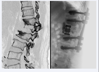 Figure 3 (a) Preoperative CT of a patient with vascular tumor of L1 with kyphotic deformity. (b) Postoperative radiograph after embolization, correction by anterior cage via MIS lateral approach and cement augmented percutaneous posterior spinal instrumentation.