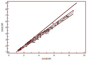 Figure 1: Passing and bablok regression analyses of DAS 28-ESR and DAS 28-CRP. Scatter diagram with regression line and confidence bands for regression line. Regression line equation: y = 0.13 + 0.85 x; 95% CI for intercept 0.03 to 0.23 and for slope 0.83 to 0.87 indicated statistically significant difference in slope and intercept.