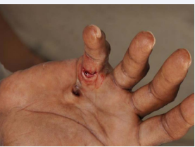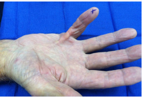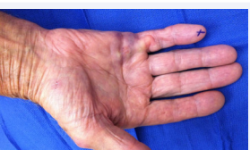 which is consistent with the current literature [9,10,13]. We found patients who had MCP contractures > or = to 60 degrees were more likely to develop skin tears, which were treated with local wound care. Skin tears typically heal rapidly with no intervention [1]. We now forewarn patients who have MCP contractures > or = 60 degrees that they are more likely to experience skin tears (Figure 3)
