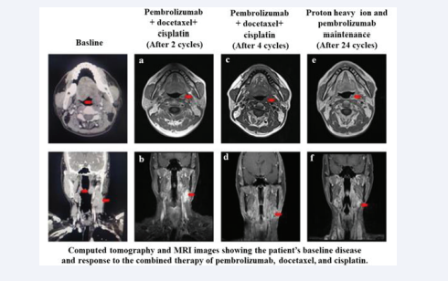 Figure 2: Computed tomography and MRI images showing the patient’s baseline disease and response to the combined therapy of pembrolizumab, docetaxel, and cisplatin.