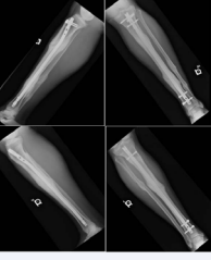 As there exist at least two fracture lines for segmental tibia fractures, the criteria for union are applied to all fracture sites within the criteria outlines above. Much attention is paid to whether the proximal or distal fracture site demonstrates a greater propensity for delayed or nonunion, though most authors agree that the distal fracture site is more often problematic for achieving union [5,8-10]. Less soft tissue coverage, decreased surrounding muscle mass, more often in communication with an open injury, and increased chance of fragment displacement is implicated in slower healing at the distal segmental fracture site [5,8]. These risk factors for altered union also hold true for proximal fractures if they have severe soft tissue damage or compartment syndrome causing muscle loss and/or fasciotomy wounds [16]. Compartment syndrome as a result of injuries causing a segmental tibial fracture has been reported to occur in approximately 7-50% of patients [5,9]. There is no different in objective or subjective criteria used for the diagnosis of compartment syndrome in this patient population. Segmental tibia fractures more often present with compartment syndrome in open fractures (14-35%) as compared to closed injuries (4- 26%) [8,16].