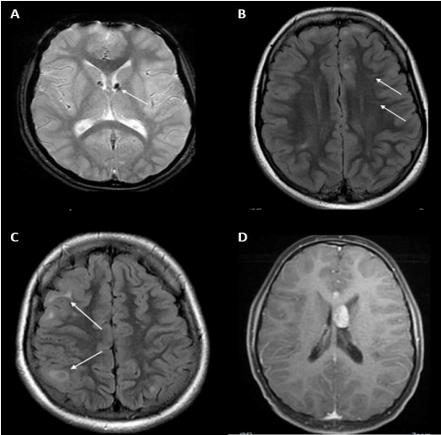 Figure 1 Brain MRI images from patients diagnosed with TSC showing characteristic features (arrows) of the disease. (A) SEN. (B) Radial migration lines. (C) Cortical tubers. (D) SEGA.