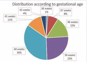 Between November 15th, 2007, and December 31st, 2018, 4020 infants were admitted to the Department of Developmental Neurology of Saint Margaret Hospital (Budapest). Among them, 91 had ischemic/hemorrhagic insult related to one hemisphere. In 12 infants, the follow up was discontinued, so the data of 79 infants were processed (among them 51 boys and 28 girls). The vast majority were born on the 39th or 40th gestational week (Figure 1).