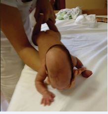 Figure 6: The elementary sensorimotor pattern of “wheelbarrow reaction” (the position is similar to “assisted crawling”, without lower limb contact). Observe finger’s extension on the right side, while the left side remains in fist due to the right side lesion!