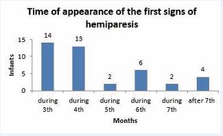 According to severity, hemiparetic symptoms were divided into two groups. One is the definite hemiparesis, where among signs, the “crossing” motion – i.e., the infant tries to reach for an object presented at one side using the hand on the opposite side – is first. During the 4th-5th months, increased muscle tone can be observed first on the upper and later on the lower limb, together with neglect of the affected limb in test situations. The characteristic position of the affected upper limb: hand in a fist, elbow flexed, shoulder rotated inside and abducted. The increased extension of the affected lower limb (plantar flexion of the feet, and hyperextension of the knee) is also prominent, and the asymmetry of walking. The other type is “latent” hemiparesis, where the tone difference is detectable only in certain test situations, and minimal asymmetry can be detected in skilled movements. Figure 8 shows the first time that hemiparesis appears in our study.