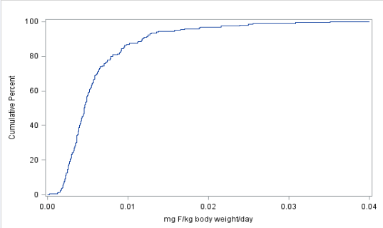 Figure 1 presents the cumulative frequency distribution for fluoride excretion per kg body weight per day.
