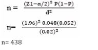The sample size was calculated using a single population proportion formula, assuming a 95% confidence level,4.8% seroprevalence of syphilis from a study conducted in Jinka Town [20], margin of error 2%, and 10% non response rate.