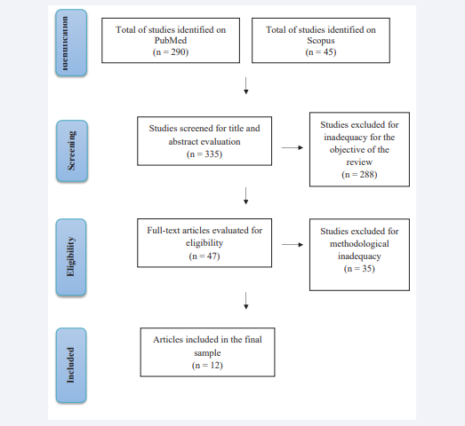 A total of 335 articles were designated for screening using the search strategy. After screening by title and abstract, 47 articles were selected for full-text evaluation. Out of these studies, 35 were excluded due to the unsuitability for the objective of this review. Thus, 12 articles were included for study and discussion in the literature (Figure 1).