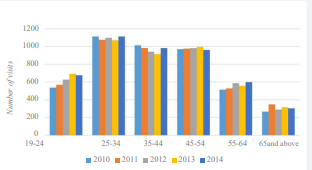 Mental health visits increased from n=4,435 visits in 2010 to n=4,662 visits in 2014 (5.1% increase) though there was no appreciable increase over the study period. Approximately (56%) visits were more likely to occur after regular hours, whereas (44%) of visits occurred during regular hours. The number of visits increased in all age groups in 2014 compared to 2010 except in age groups 35-44 years. The number of visits among adults 45- 54 years decreased from n=1,014 in 2010 to n=980 in 2014 and n= 968 in 2010 to n=961 in 2014 respectively. As illustrated in Figure (1), age groups 25-34 years remain fairly constant and accounted for most of the visits throughout the study period (2010-2014).
