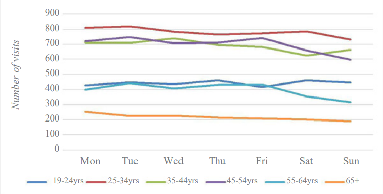 Figure 2: Mental health visit by Weekday and Age group.