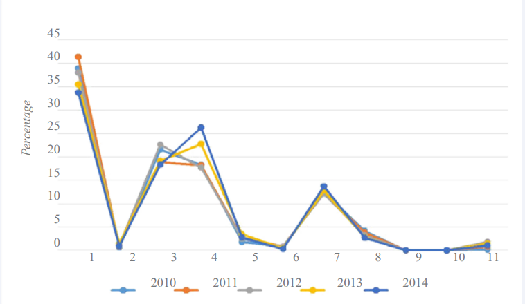 Throughout the study period (January 1, 2010-December 31, 2014), there was a significant increase in the diagnostic presentations and trends by year, month and day of the week for adult. The summer months of June to August accounted for most visits (26.57, n=6,035) followed by March-May (25.98%, n=5,900) September-November (24.57%, n=5,580) and December-February (22.88%, n=5,196). Majority of the visits (15%, n=3,409) were more likely to occur on Tuesday with (13%, n=2,956) of visits least likely to occur on Sunday. Overall, the weekend accounted for 26.7% of the visits as shown in Figure (2).