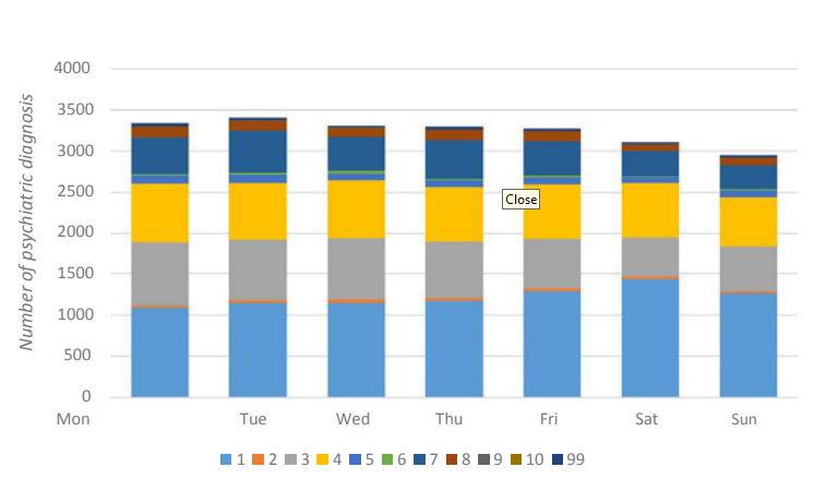 Mental health diagnosis by year, month and day of the week