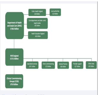 The Department of Health and Social Care allocates funds from its overall budget to support health care (DHSC). The DHSC budget in England for 2019/20 was $138 billion. NHS England has received the vast majority of this funding. In addition, DHSC funds independent organizations such as the Care Quality Commission, NHS Improvement, and the National Institute for Health and Care Excellence (NICHE), distributing the remaining funds (NICE). Ministers have ordered that NHS England’s funds be used to fulfil its obligations to the health and social care system (DHSC) [6]. NHS England monies are allocated by Clinical Commissioning Groups (CCGs) and local governments. Spending on health care services accounts for most CCG funds (£79.9 billion in 2019/20) [7]. Direct national commissioning (£41.1 billion in 2019/2020) includes specialist services (£19.1 billion), primary care (£8.8 billion), and maintenance, military, and offender services ($7.0 billion)-more than half of NHS England’s remaining resources (Figure 1).
