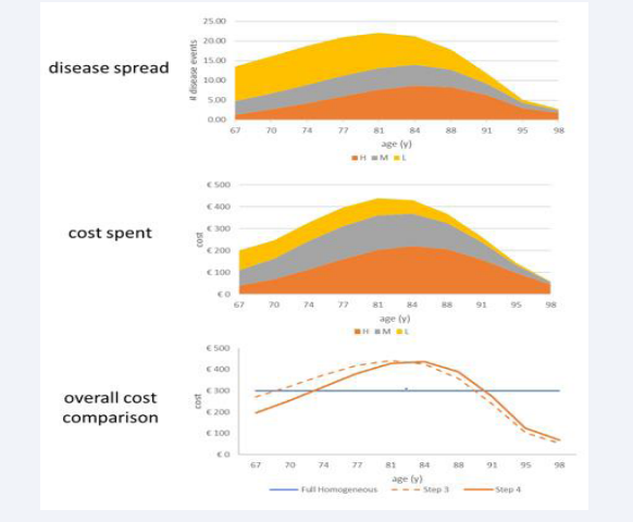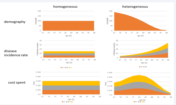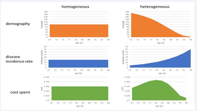 Results: The assumed full homogenous dataset systematically overestimates up to 10% the overall disease management cost in aging adults when compared with a group simulated with non-homogeneous, but realistic distributions for age, infection, severity, and cost, mainly due to the difference in the demographic age composition. However, overall costs of a proposed homogeneous condition tend to underestimate the spending of non-homogeneous conditions when the reference case has a partially homogeneous setup instead of a full condition or when the demographic age-change in the non-homogeneous condition evolves towards age-demographic homogeneity (same number of people at each age with increasing age), a likely evolution in the coming 15 to 30 years.