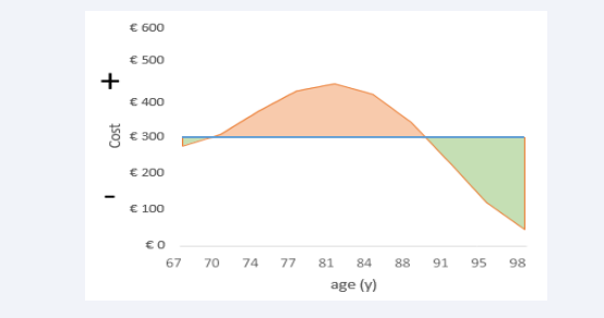 This analysis did not include all possible factors that could have an unbalanced spread across the population group, as it would have been too complex to model non-homogeneity if all known factors had been considered. However, the following additional elements could be considered that might influence the overall cost results with their unequal distributions across the group: sex; health condition expressed as the level of co-morbidities present in numbers and severity; frailty and disability; place of living (home, nursing homes, service flats); and hospitalisation. Regarding frailty, a recent review has shown the bidirectional movement of infection that influences the frailty condition of the individual and vice versa [13]. This may complicate the correct assessment of the total infectious disease cost burden and the impact estimate of new interventions on that health condition, such as vaccination [17]. It is known and reported that frailty increases exponentially with aging, which may justify the exploration here of exponential graphs for infectious diseases [25]. The better knowledge about frailty that increases with time allows for considering more appropriate and efficient prevention programs in aging adults [14].