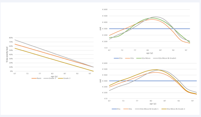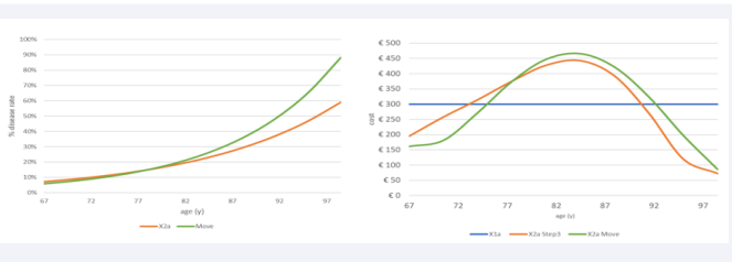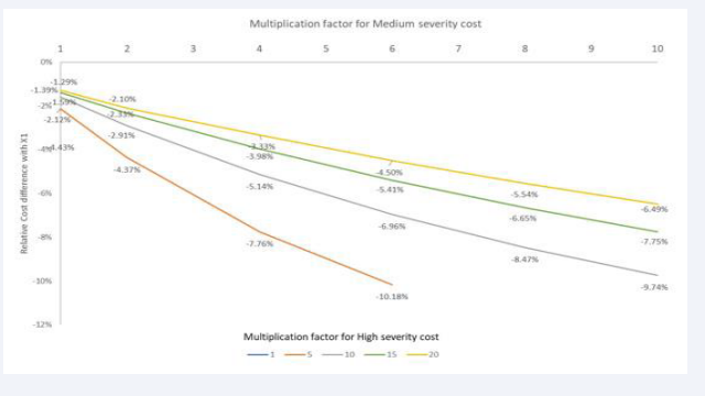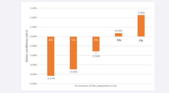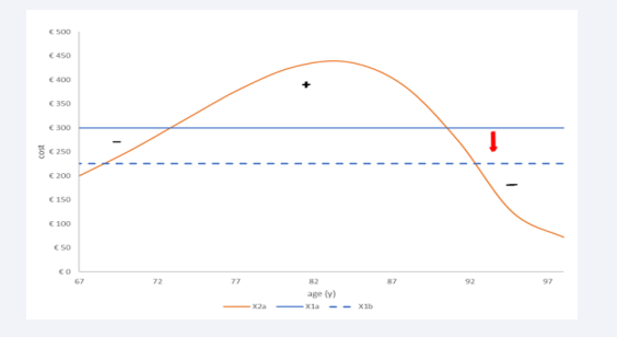 Another surprising finding is that higher costs for the treatment of more severe cases may not result in an obvious change in the cost difference between an assumed homogeneous evaluation and an adjusted non-homogeneity evaluation, as indicated in (Figures 10,11). The result could move in the opposite direction, with a higher negative cost difference with higher cost for the more severe cases, because the average cost in the homogeneous situation X1 also increases (Figure 11). Additionally, changes in demographic composition may take time before a substantially higher cost is observed when substantially more people are living longer, as (Figures 12,13) indicate [24].