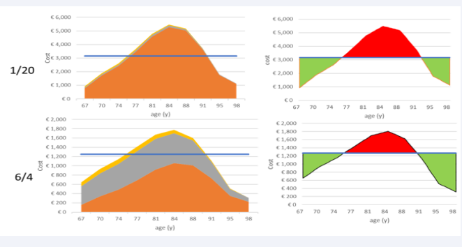 An element of concern is the effect of non-homogeneous factors that are unbalanced in the opposite direction across the group, with strange consequences for the summary assessment. For example, with an ageing population, the decline in numbers of individuals in progressively older age groups, due to the increase in mortality with age, is not programmed as a gradual linear decrease with age but instead follows an accelerated course causing a highly unbalanced age distribution in the overall study group. Infection spread moves in the opposite direction, with higher prevalence rates in the older groups because of worsening health conditions with increasing age. There is a perception that aging induces an overall healthcare cost increase [22,23]. The example here, estimating overall healthcare costs of infectious disease management in ageing adults, indicates the opposite. This shows that the overall cost may be lower when adjusted for non-homogeneity compared with the overall cost of a study group when assumed to be fully homogeneous. This happens when the age structure is heavily unbalanced (fewer very old people), which imposes a lower absolute number of highly severe and costly treatments, despite having proportionally much more severe disease present in those older age classes. This lower overall cost estimation may seem counterintuitive, but (Figure 5) shows that it is possible. If, however, the age imbalance gets marginal (Figure 7), which is likely to be the development over time as the whole population lives longer, the problem of infectious diseases with more severe cases in the older groups could increase the overall cost above the homogeneously assumed estimates. Managing infectious disease in ageing people could therefore become a serious threat to tackle to help control healthcare cost increases over time.