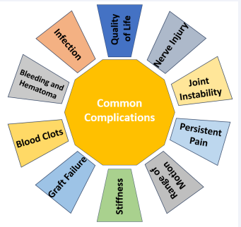 Surgery, immobilization, and reduced mobility during the recovery period can increase the risk of blood clot formation (deep vein thrombosis). Blood clots can be serious if they travel to the lungs (pulmonary embolism). Measures such as early mobilization, compression stockings, and blood-thinning medications may be used to reduce this risk.