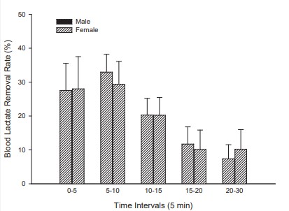 Numerous researchers have examined lactate removal after strenuous exercise. The rate of removal of lactate from the blood was accelerated up to about two fold by performance of light aerobic exercise during the recovery period [17, 18]. The elimination of lactate from the blood following exhaustive work appears to be due to an increased blood flow and more rapid transportation of lactate to the liver for resyntheses of glycogen and the oxidation of lactate to CO2 and water in the working muscles [19, 20]. Several researchers have found that the optimal intensity for blood lactate removal during recovery exercise approximates 40 to 60%VO2 max [18, 21-23]. Results from studies comparing gender differences in blood lactate accumulation are limited and equivocal, and no studies were found where the researchers specifically examined gender differences in blood lactate removal after strenuous exercise. Therefore, the purpose of the present study was to compare gender differences in peak blood lactate concentration and removal rate following strenuous exercise.