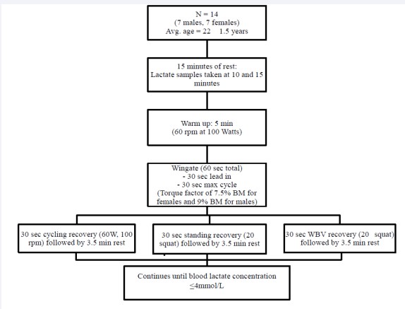 Immediately following the WAnT, a blood lactate sample was taken while the subject was still on the Velotron bike and the 3.5 min passive recovery began. Following the 3.5 min, a 30sec recovery modality (WBV, standing, cycling) was implemented (Figure 1) where a blood lactate sample was taken at the onset of the seated 3.5 min rest period. The subjects repeated these 4 min intervals (30sec of recovery, lactate sample at onset of 3.5 min of rest) until blood lactate concentration were ≤4.0 mmol/L. Each of the three recovery sessions (WBV, standing, cycling) were separated by 48 hrs to a maximum of 4 days between two tests.