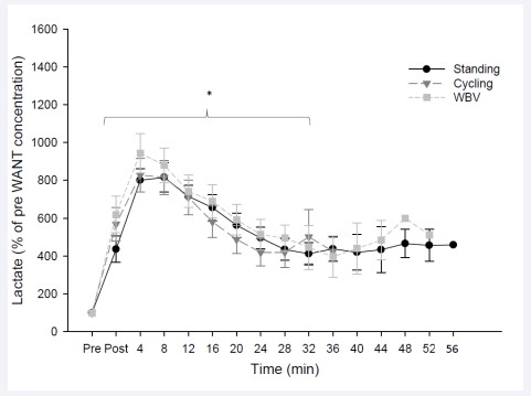 Methods: Males (n=7, 22.0±1.1 y) and females (n=7, 22.9±1.8 y) undertook a Wingate where blood lactate concentration was measured from a venous catheter in the antecubital vein prior-to, immediately-after and every subsequent 4 mins until lactate was <4 mmol/L. Three recovery modalities (standing, stationary cycling, whole body vibration (WBV)) were executed on three separate days. Standing and WBV consisted of a 20° semi-squat on a platform. The WBV was set to 35Hz and 2mm. Stationary cycling was performed at 60Watts (W) and 100rpm. Each recovery was conducted for 30 sec followed by 3.5 mins of rest. Results: Females reached a higher peak lactate concentration (10.9±1.9 mmol/L) than males (9.4±1.6 mmol/L) (p<0.001) following the Wingate. Venous lactate after WBV was not different from standing and both methods were less effective than cycling (p=0.003).